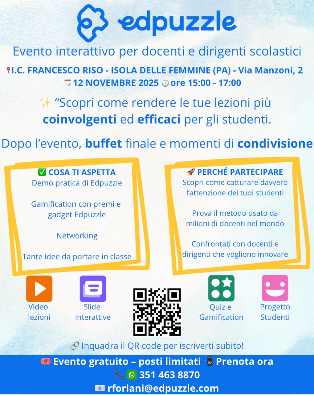 Mercoledì 12 novembre 2025, dalle 15:00 alle 17:00, l’I.C: Francesco Riso ospiterà un evento interattivo organizzato da _*EdPuzzle*_ dedicato a docenti e dirigenti scolastici.