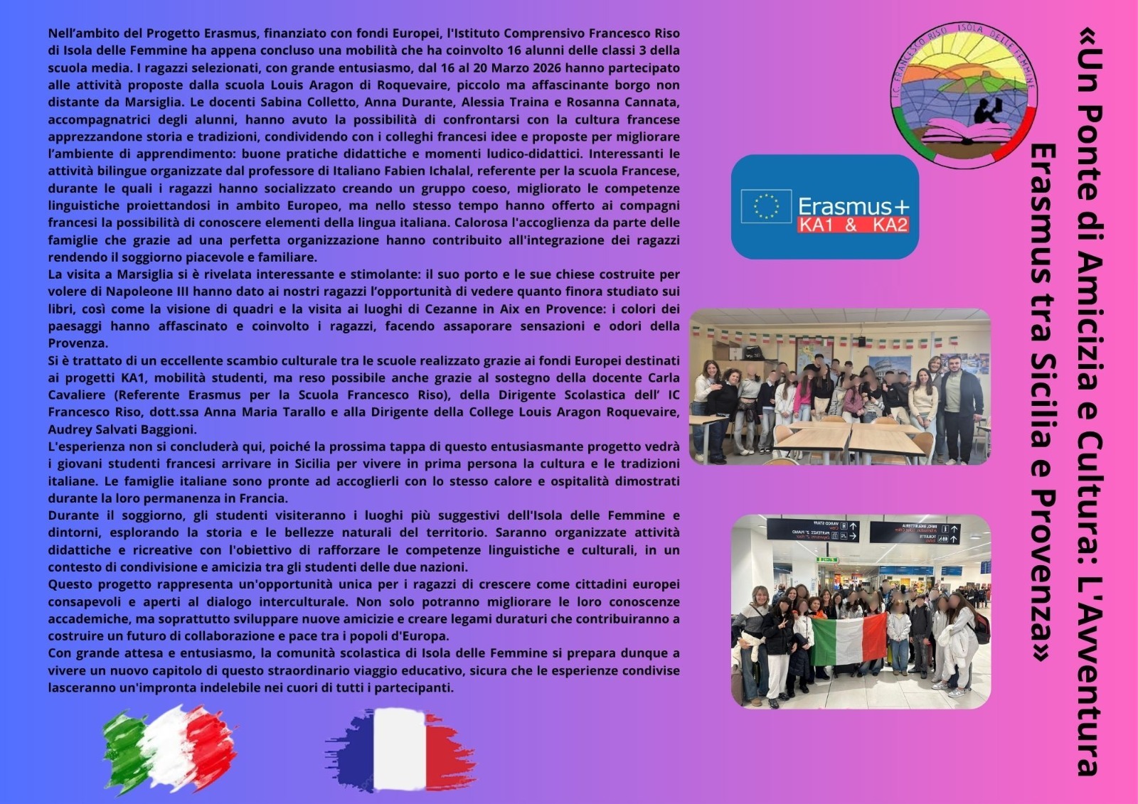HomeIn primo piano Attività ed eventi - Scuola Secondaria di I grado Attività ed eventiL’avventura Erasmus in Sicilia e Provenza L’avventura Erasmus in Sicilia e Provenza Categorie Attività ed eventi Attività ed eventi - Scuola Secondaria di I grado In primo piano Data: 12/04/2026 Attivazione rientri pomeridiani Progetto Scuola Attiva Junior (attivita di hockey)